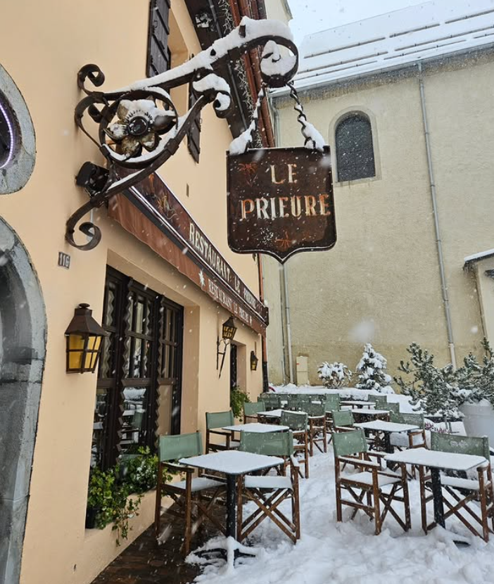 Le Prieuré à Megève offre une cuisine de bistrot savoyarde dans un cadre montagnard élégant.